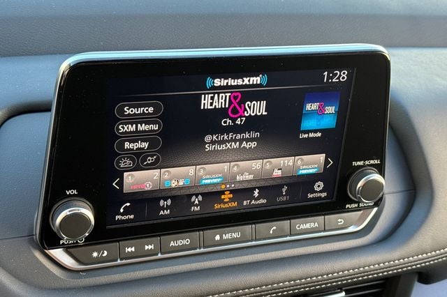 - Radio: AM/FM NissanConnect -inc: 6 speakers plus 2 tweeters, Apple CarPlay, Android Auto, 8" color touch screen display, Bluetooth®, 2 front USB type-C, Wi-Fi hotspot and NissanConnect Services powered by SiriusXM