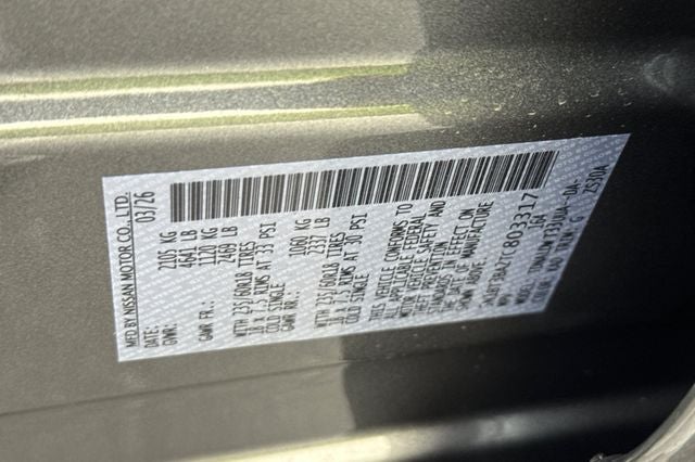 29/36 City/Highway MPG All vehicles are subject to prior sale. Price does not include applicable tax, title, license, $85 Doc fee and $33 Electronic DMV filing fee. Contact Dealer to verify if you qualify for displayed Nissan Offer. Must qualify through Nissan Motor Acceptance Corporation for applicable rebates. Not responsible for typographical errors. Nissan Offer* includes: $3500 - Nissan Customer Cash. Exp. 05/04/2026