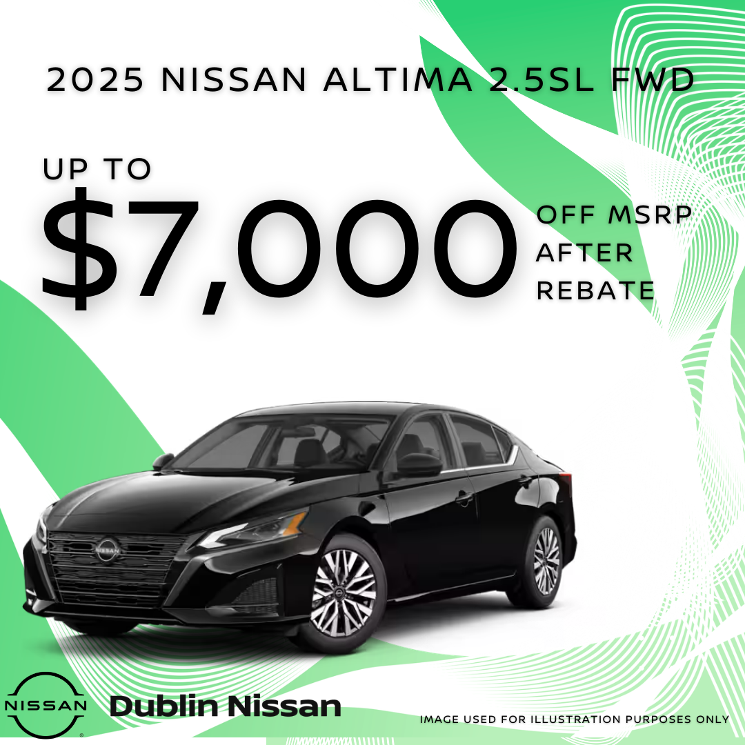 Dublin Nissan, Dublin San Francisco Bay Area and N California.1 @ this price 2025 NISSAN ALTIMA 2.5SL. ONLY 1 AT THIS PRICE: VIN 1N4BL4EV0SN425466 MSRP OF $35,940 DUBLIN INCENTIVE $4,000 PLUS $3,000 MY25 Bonus Cash for a Total of $7,000 off. Offer can not be combined with special apr or lease. Prices do not include government fees and taxes, any finance charge, any dealer document processing charge, any electronic filing charge and any emissions testing charge. PLUS DEALER ADDED ACCESSORIES. Offer Expires 03/31/2026