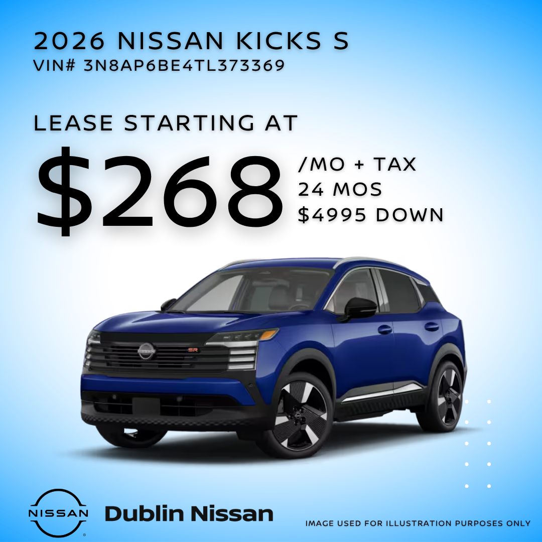 Lease this 2026 Nissan Kicks (Model 21116, VIN 3N8AP6BE4TL373369). MSRP $ 24,455 . With $ 4995 down at $ 268 for 24 months, on approved credit. $0.00 security deposit required. $ 4995.00 due at signing - includes 1st mo. payment of $ 268. Total payments: $6,432. Must finance through Nissan Motor Acceptance Corporation. On approved credit, Selling price $23,500,Tax, title, license, and $85.00 dealer doc fee are extra. Offer assumes these paid at time of sale. Lessee responsible for maintenance, repairs, excessive wear and tear, and $0.25/mile over 10000 miles/year. Early lease termination fee may apply. Option to purchase vehicle at lease end is $ 16,629.40. On approved credit, Offer cannot be combined with any other offers. Residential restrictions may apply. Available on in-stock units only. See dealer for complete details. Offer Expires: 05/1/2026.