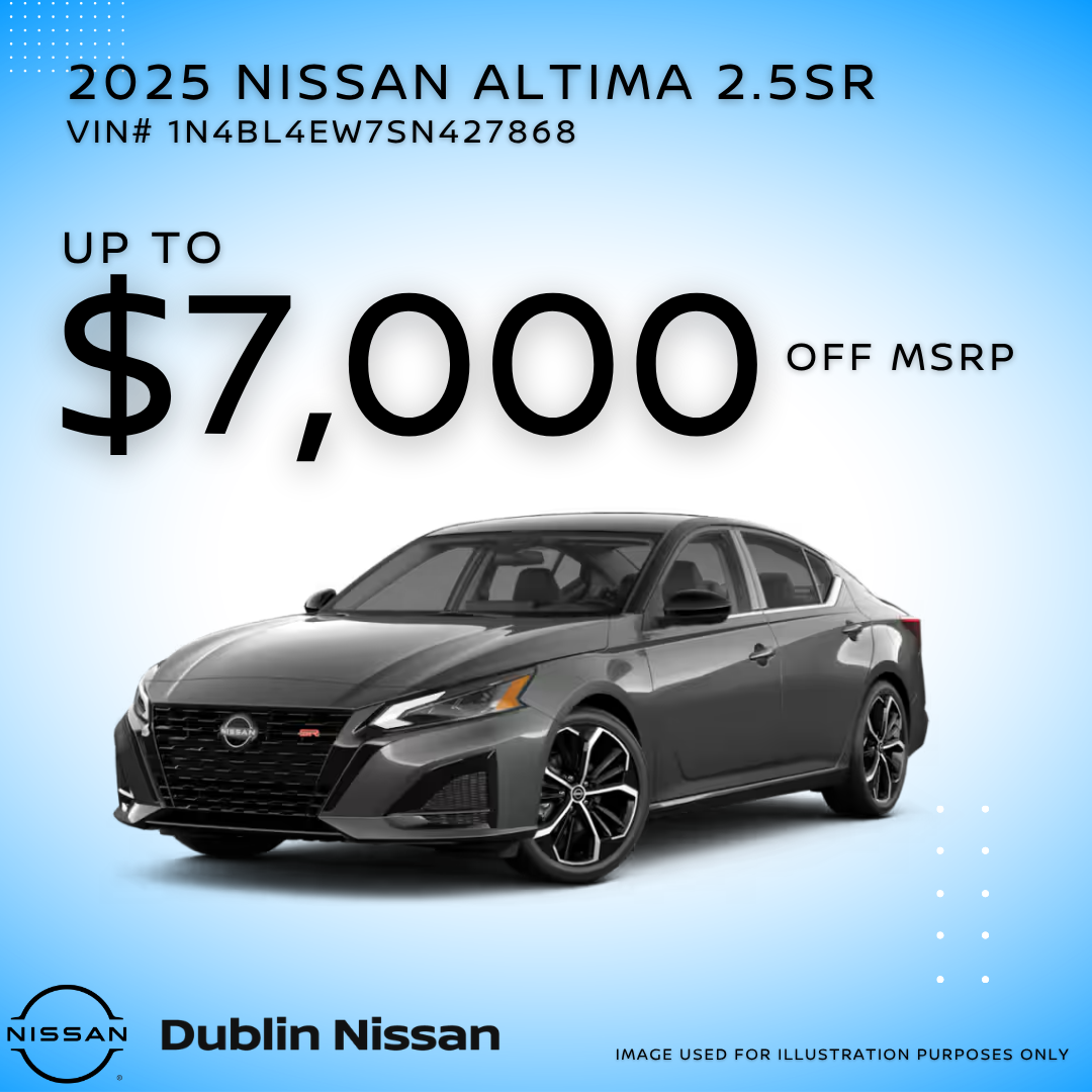 2025 NISSAN ALTIMA 2.5SR. ONLY 1 AT THIS PRICE: VIN: 1N4BL4EW7SN427868. MSRP $38,100. ONE At this price, Dealer Discount $ 7000 ,for a Total of $7,000 off. Offer can not be combined with special apr or lease. Prices do not include government fees and taxes, any finance charge, any dealer document processing charge, any electronic filing charge and any emissions testing charge. Offer Expires 05/1/2026