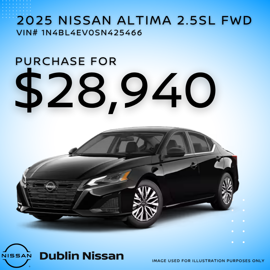 Dublin Nissan, Dublin San Francisco Bay Area and N California.1 @ this price 2025 NISSAN ALTIMA 2.5SL. ONLY 1 AT THIS PRICE: VIN 1N4BL4EV0SN425466 MSRP OF $35,940, Dealer discount$ 7000 Offer can not be combined with special apr or lease. Prices do not include government fees and taxes, any finance charge, any dealer document processing charge, any electronic filing charge and any emissions testing charge. Offer Expires 05/1/2026
